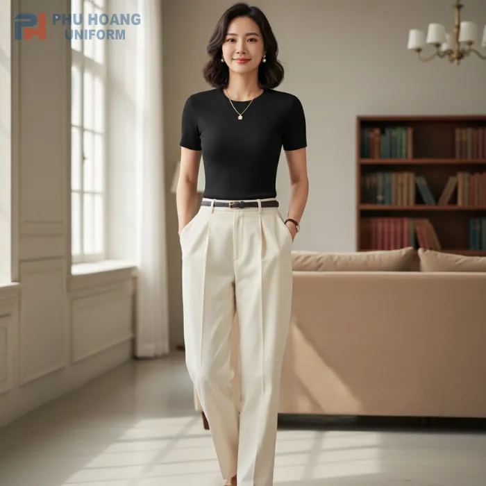 Kết hợp áo thun ôm cổ tròn màu be hoặc trắng với quần tây cạp cao, thắt lưng da nâu và đôi loafer hoặc kitten heel. Thêm một chiếc blazer vải linen hoặc wool mỏng, bạn sẽ có ngay outfit gọn gàng, sang trọng nhưng vẫn mềm mại – đúng chất “nữ doanh nhân Old Money”.