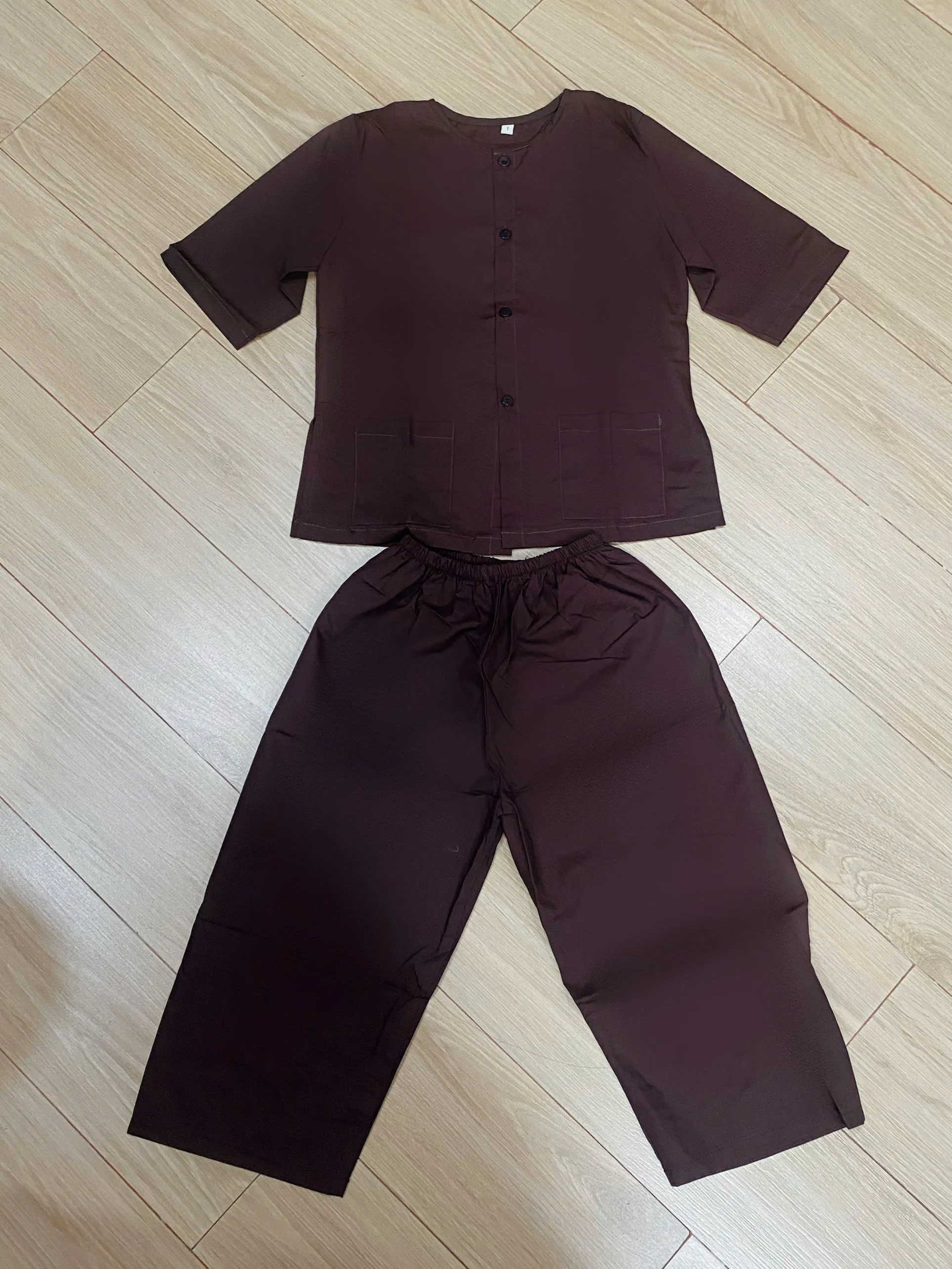 Bộ đồ nâu trơn dễ phối cùng khăn rằn, nón lá, giày trắng, hoặc phụ kiện văn nghệ. Nếu dùng cho trường học hoặc nhóm hoạt động, phần thân áo trơn cũng là “khung” lý tưởng để thêu hoặc in logo nhỏ – giúp tăng nhận diện tập thể.