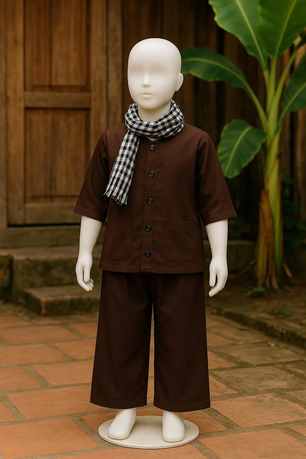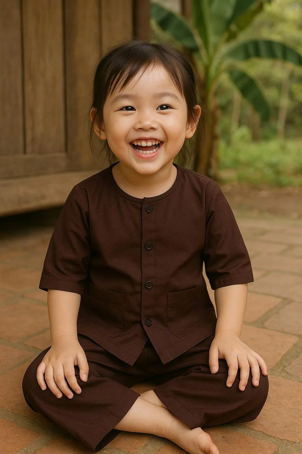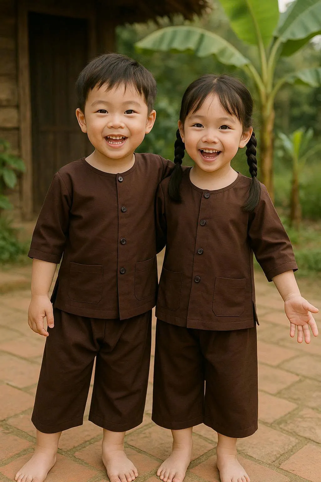 Gam màu nâu của ST005 mang vẻ ấm áp, gần gũi với văn hóa truyền thống Nam Bộ, giúp bé trông lịch sự và dễ hòa nhập trong môi trường học tập, hoạt động văn hóa. Bên cạnh đó, màu nâu ít lộ vết bẩn – rất thích hợp cho trẻ em khi chơi đùa hay tham gia hoạt động ngoài trời.