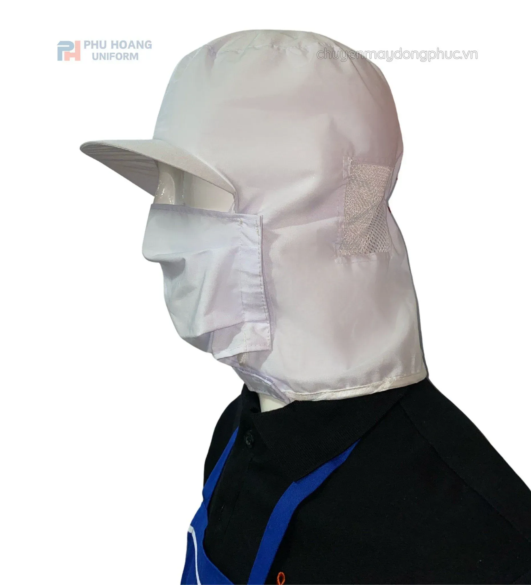 Kiểu dáng: Nón trùm đầu kín tóc, vành trước, liền khẩu trang, che mồ hôi, phần sau lưới thoáng khí để thoát hơi nóng