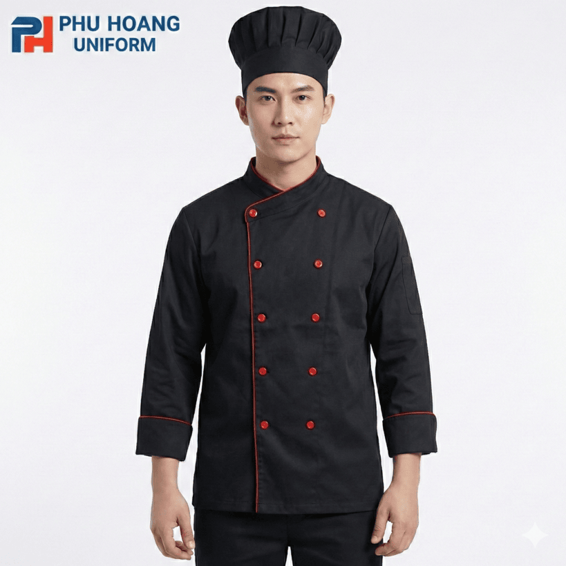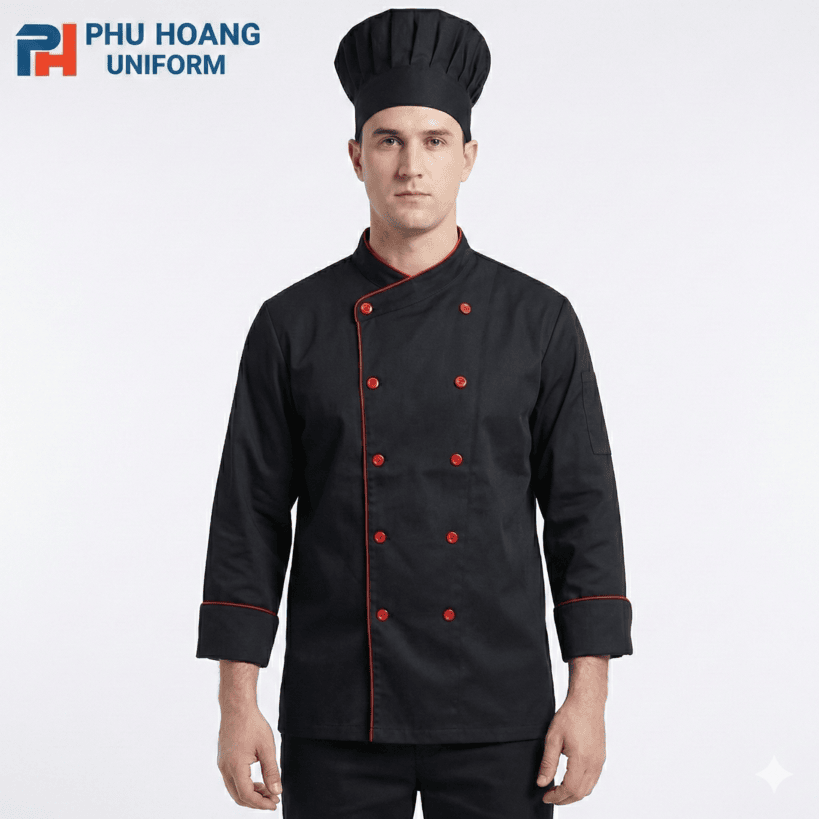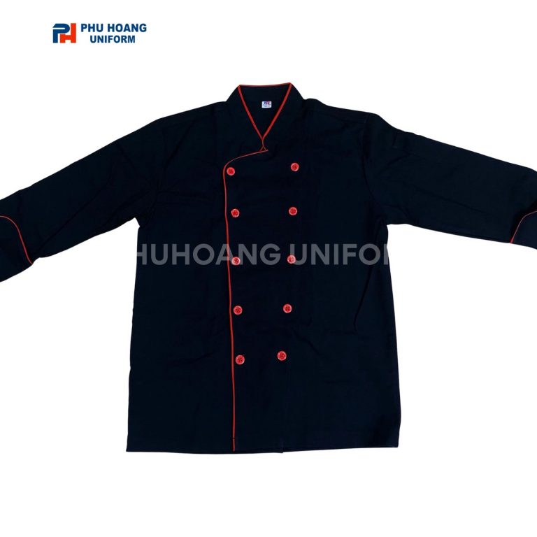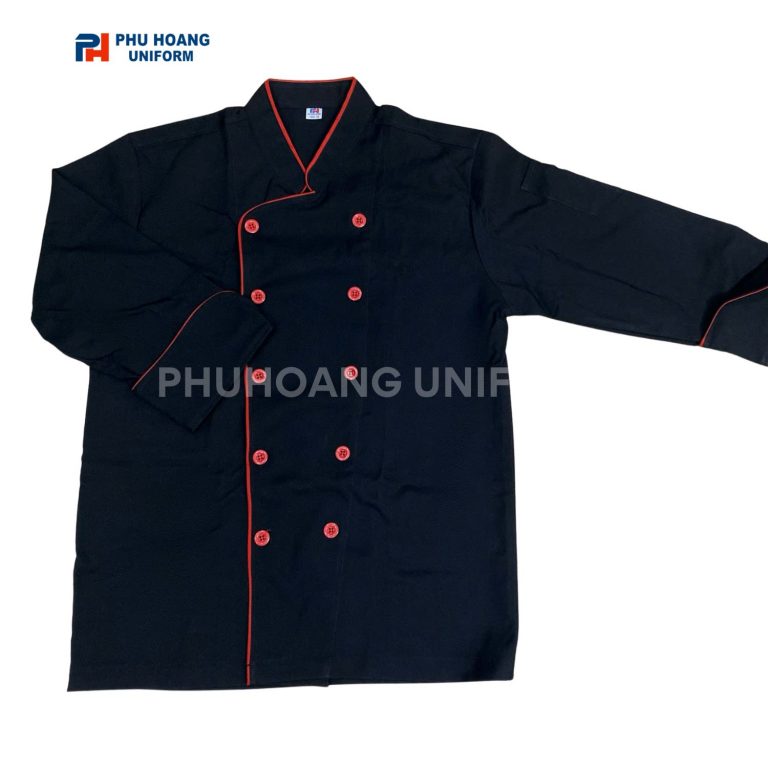 Với kinh nghiệm lâu năm trong lĩnh vực đồng phục, Phú Hoàng mang đến giải pháp đồng phục bếp chuyên nghiệp, giúp doanh nghiệp tiết kiệm thời gian, chi phí và đảm bảo hình ảnh đồng bộ. Áo bếp tay dài đen viền đỏ kaki thun chính là minh chứng cho sự kết hợp hoàn hảo giữa công năng và phong cách.