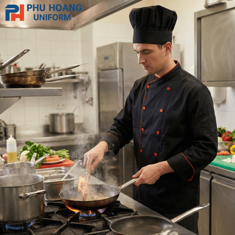 🎨 MÀU SẮC ĐEN VIỀN ĐỎ – DẤU ẤN MẠNH MẼ CỦA ĐỒNG PHỤC BẾP