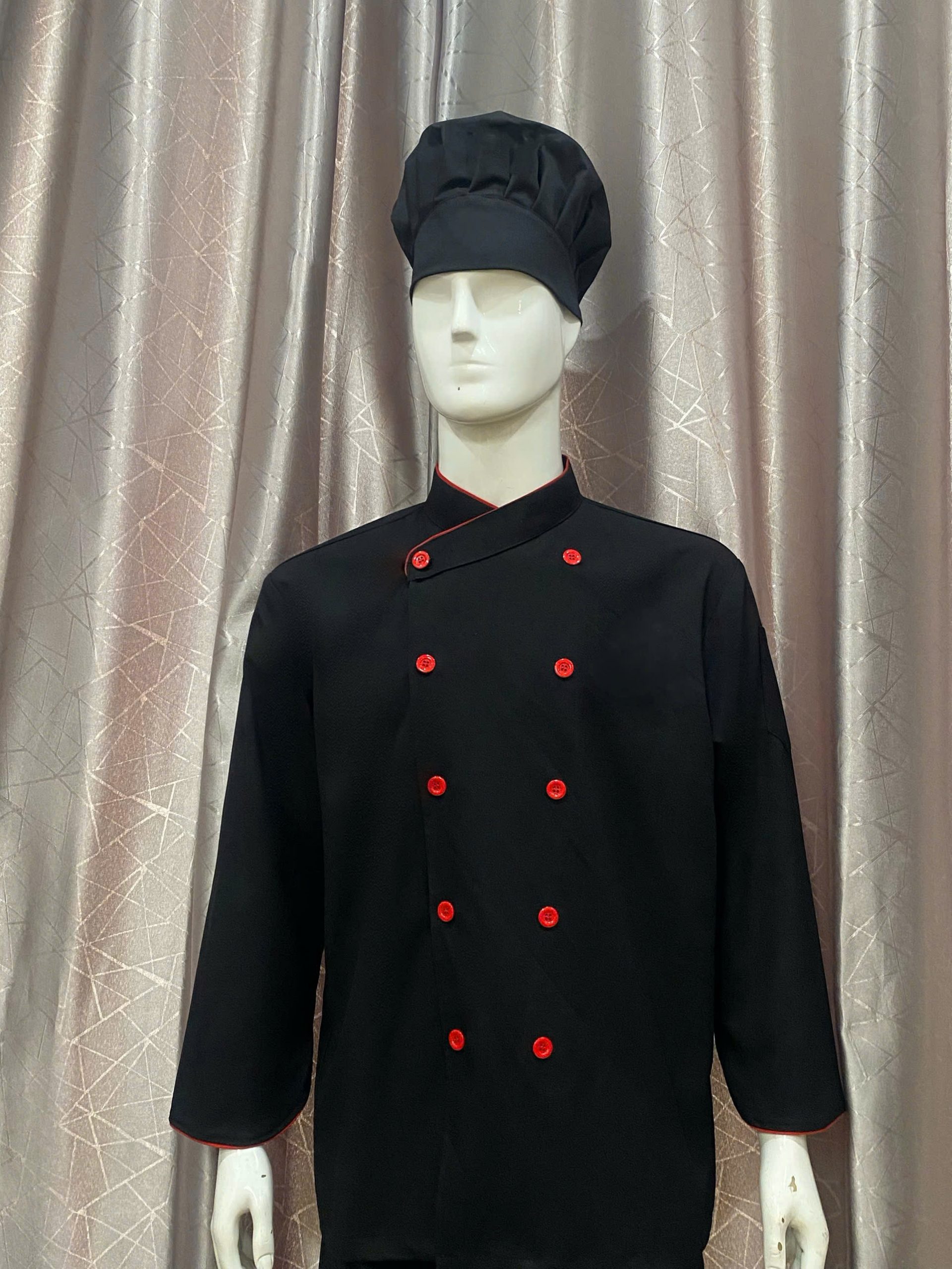 Tông màu đen chủ đạo luôn được xem là lựa chọn lý tưởng trong môi trường bếp bởi khả năng che vết bẩn tốt, giữ hình ảnh gọn gàng trong suốt ca làm việc dài. Khi kết hợp cùng đường viền đỏ nổi bật, chiếc áo bếp không còn đơn điệu mà trở nên mạnh mẽ, cá tính và dễ nhận diện vị trí nhân sự trong bếp. Sự tương phản đen – đỏ tạo cảm giác chuyên nghiệp, hiện đại, phù hợp với phong cách bếp nhà hàng cao cấp và bếp mở. 🍽️🔥