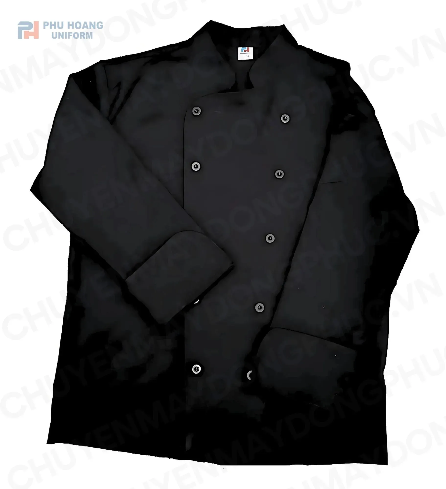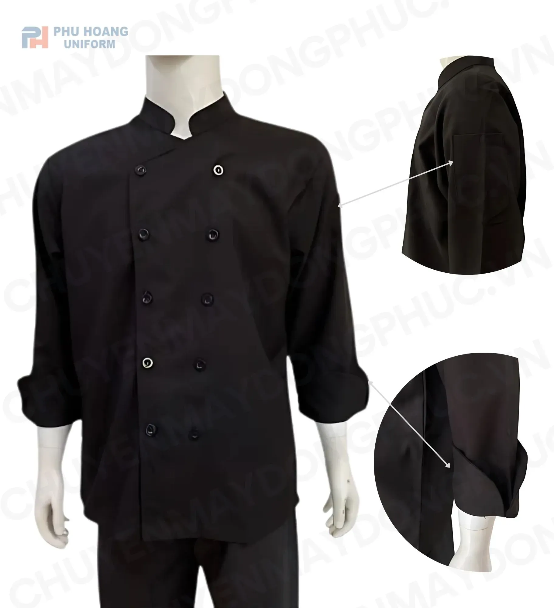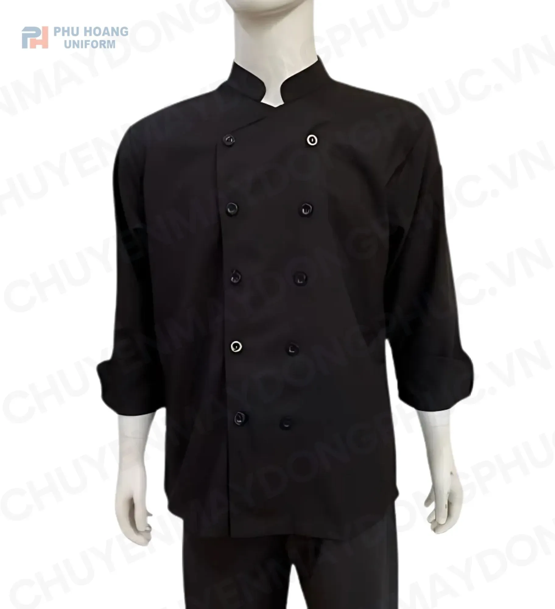 Mẫu áo bếp màu đen tay dài cổ trụ, thiết kế đơn giản nhưng tinh tế. Áo thích hợp cho môi trường bếp chuyên nghiệp cần sự nghiêm túc và sạch sẽ. Sản phẩm là lựa chọn tối ưu cho các bếp trưởng, nhà hàng khách sạn. Thiết kế hai hàng cúc truyền thống, chất vải dày dặn giúp bảo vệ khi thao tác ở nhiệt độ cao.