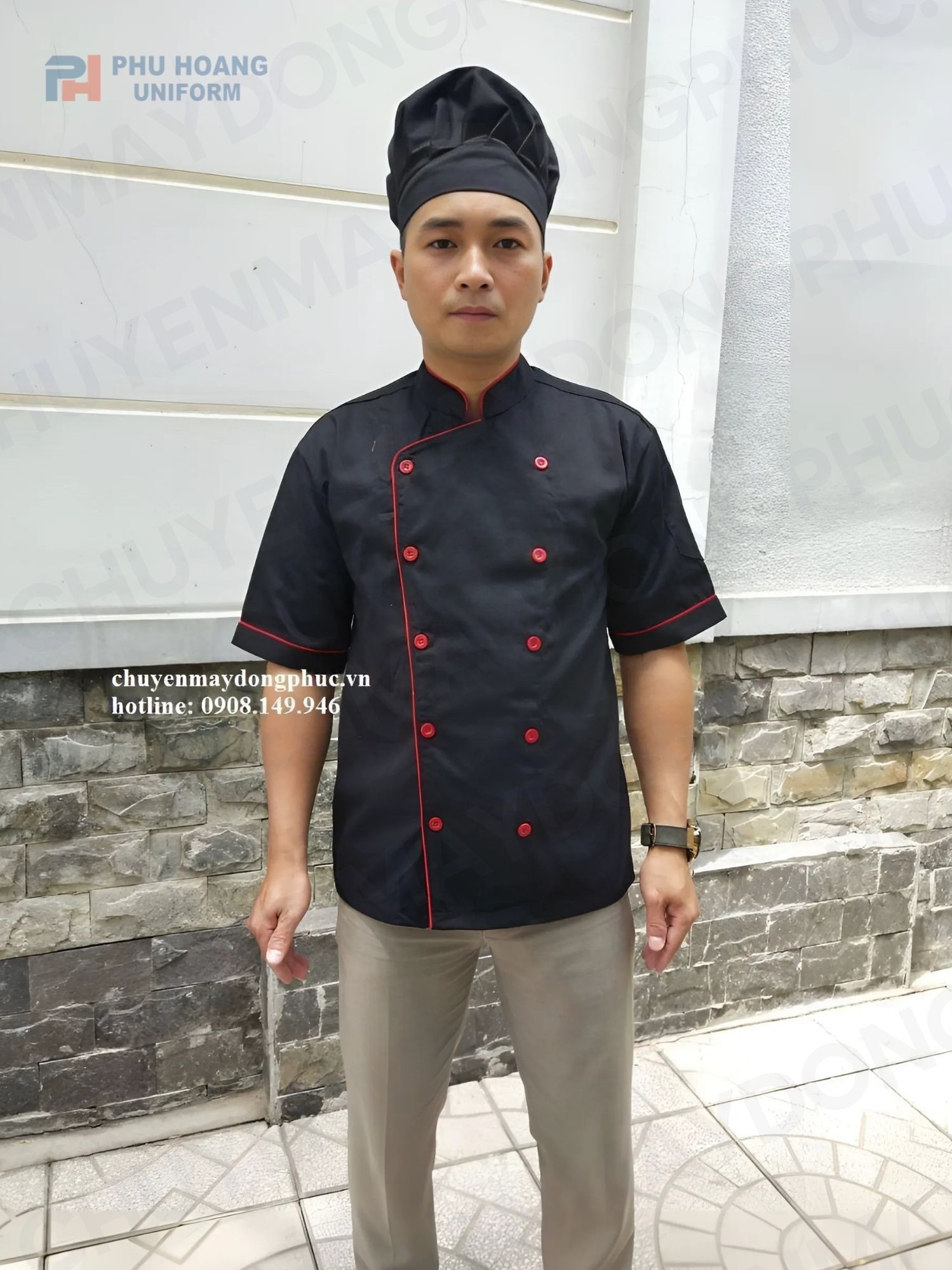 ÁO BẾP KAKI ĐEN VIỀN ĐỎ TAY NGẮN SB006 (MAY SẴN)