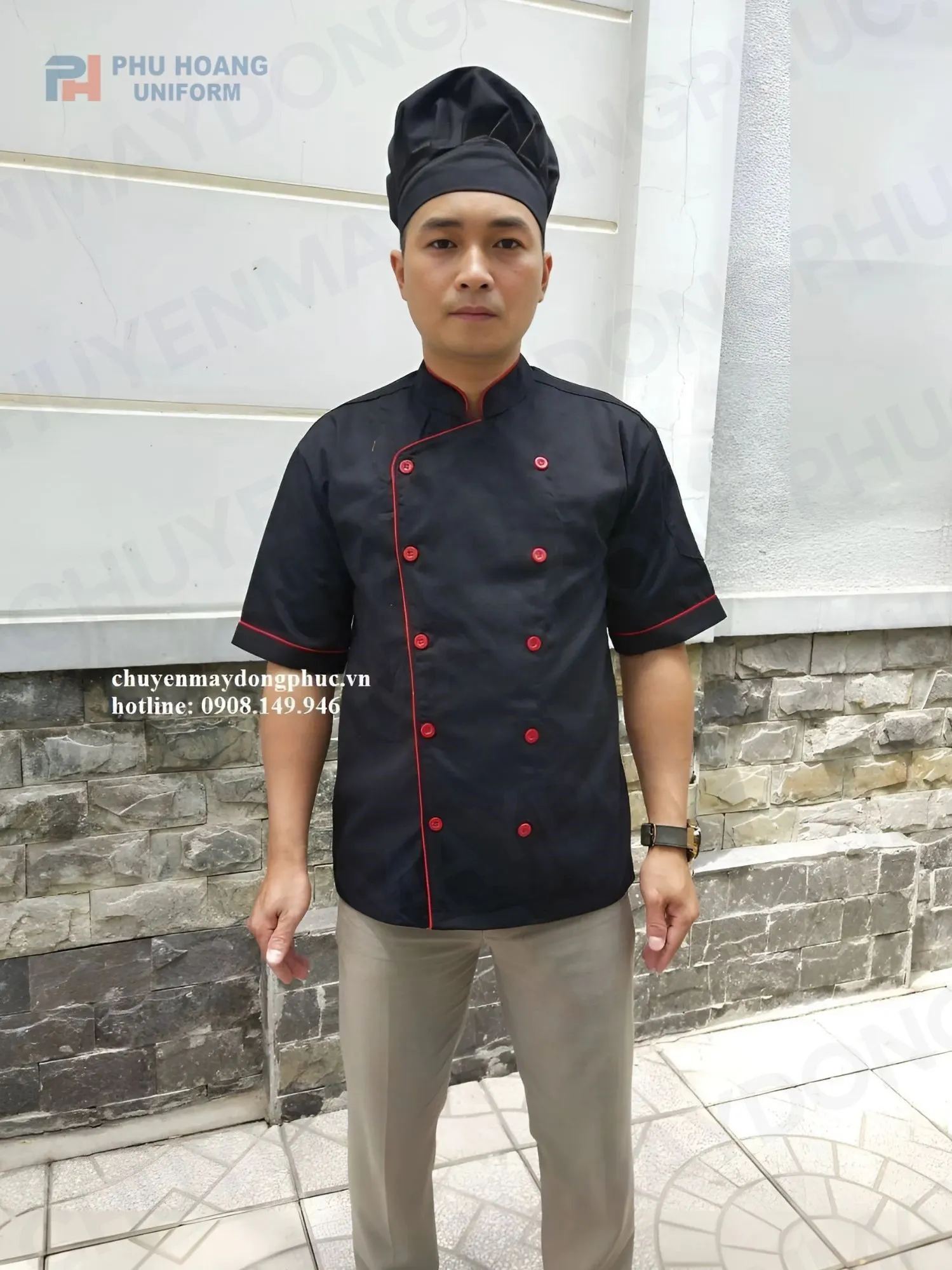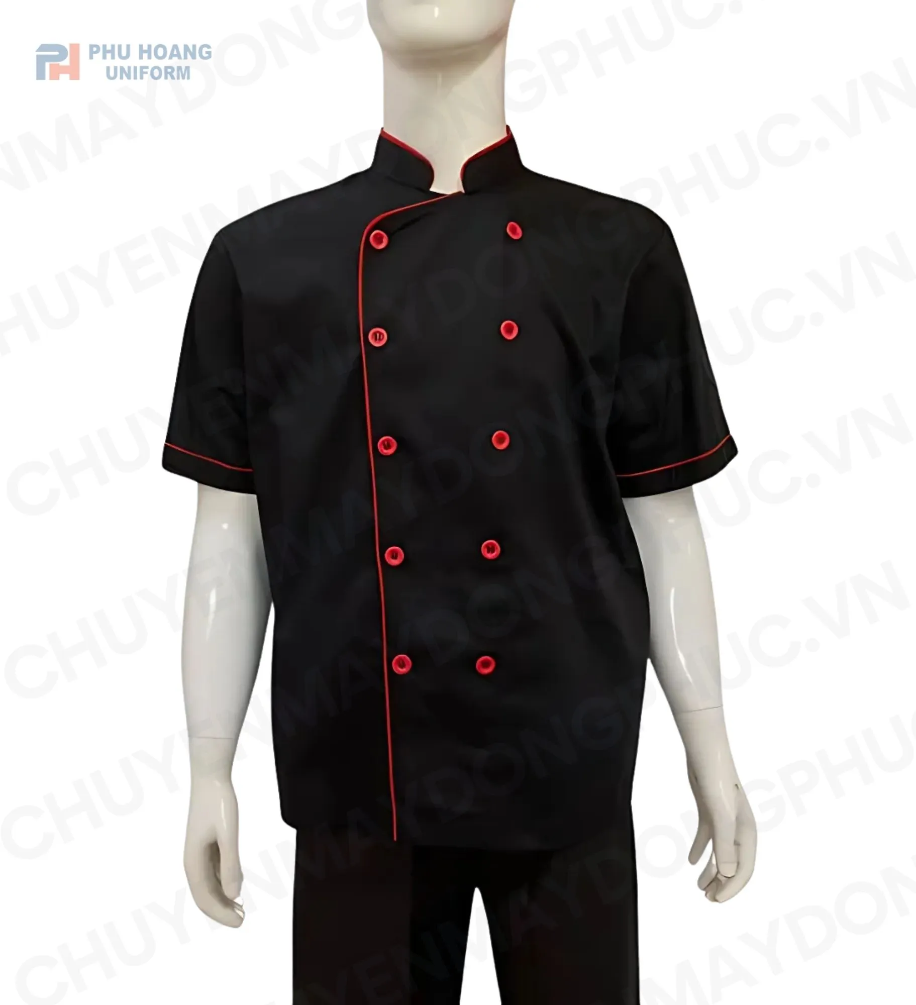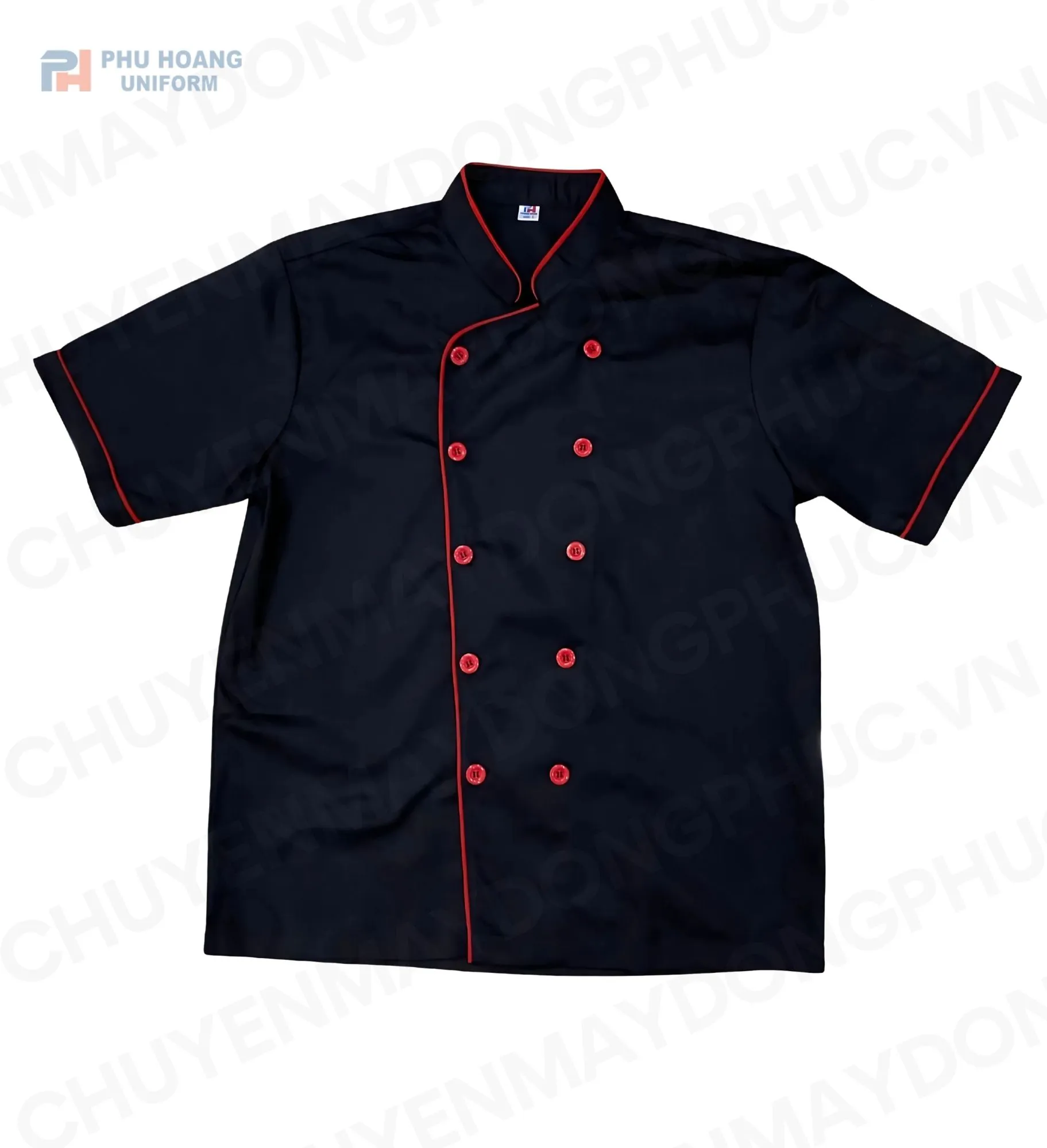 Áo bếp may sẵn màu đen viền đỏ nổi bật, mang phong cách hiện đại, cá tính. Đồng phục bếp màu đen sang trọng, sạch sẽ, ít bám bẩn đặc biệt phù hợp với không gian bếp mở.