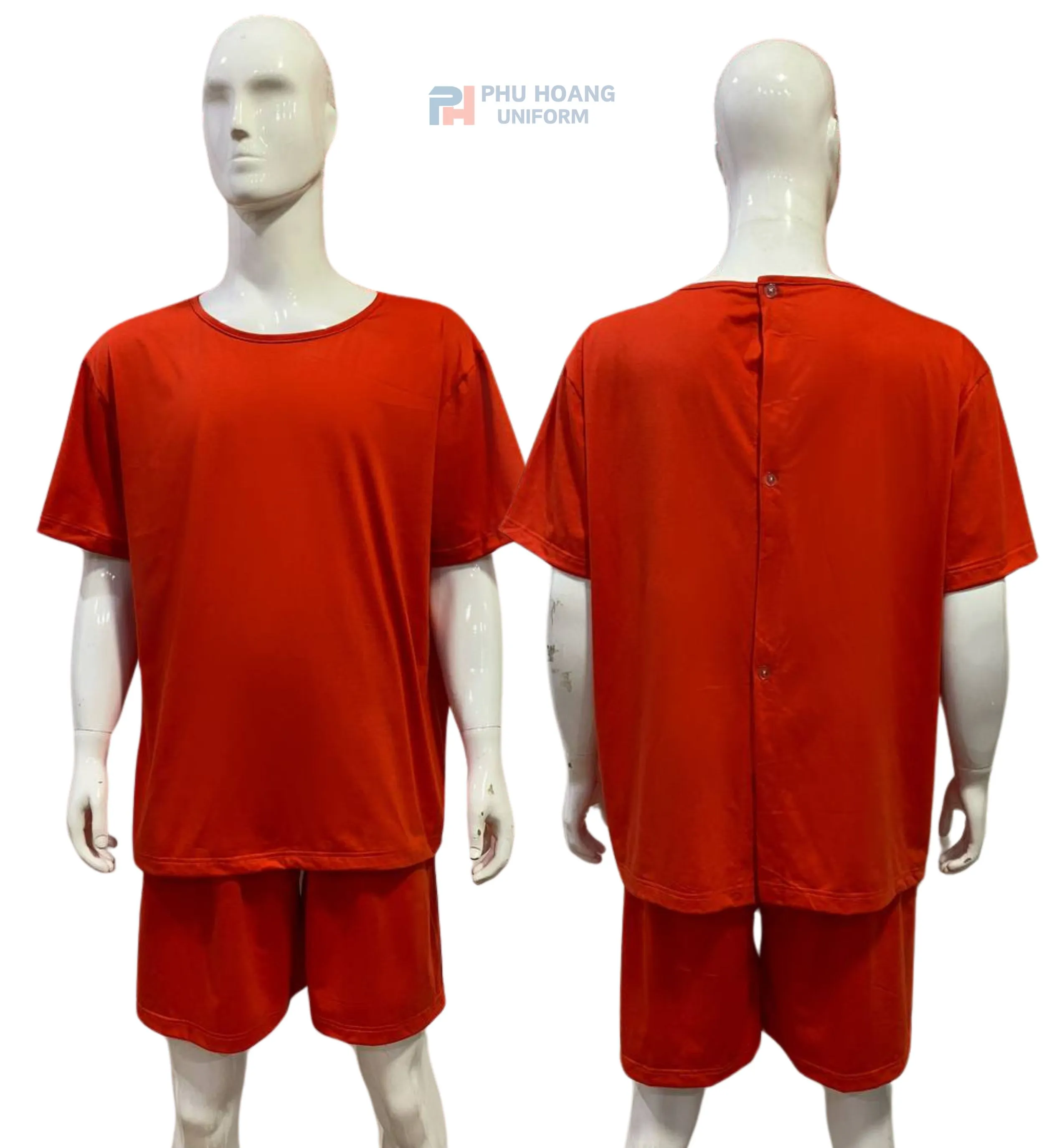 Kiểu dáng: Áo cổ tròn, tay ngắn, nút bấm phía sau lưng, quần short lưng thun tiện lợi.