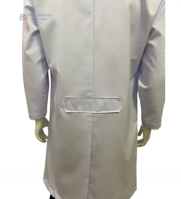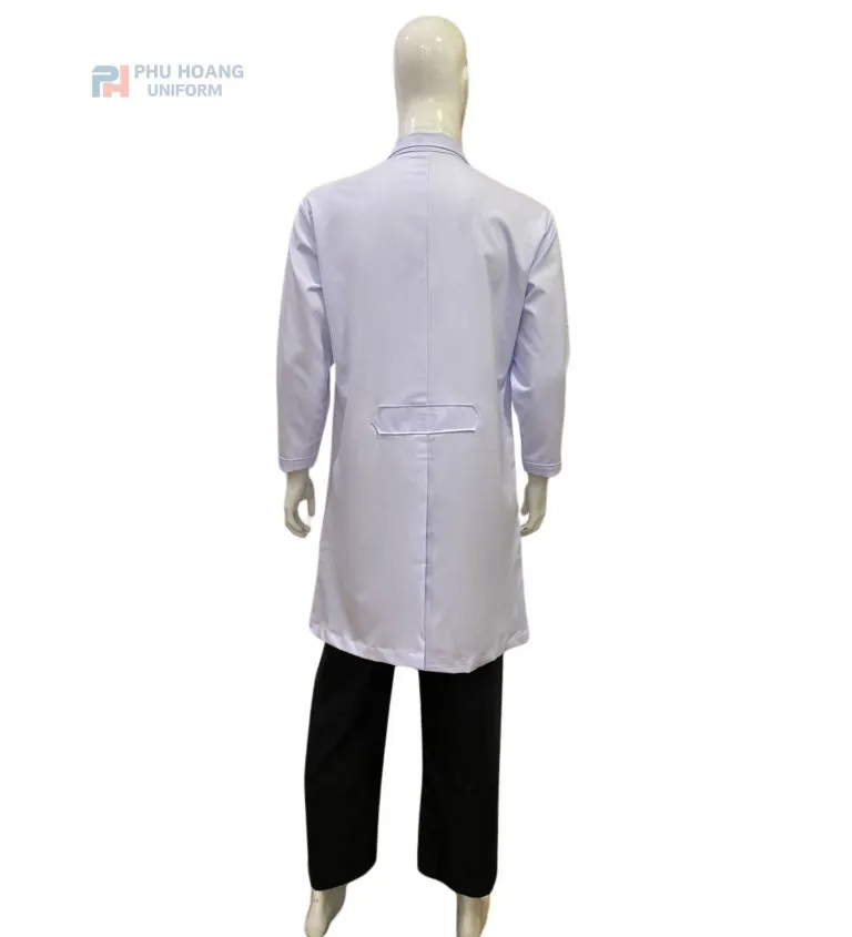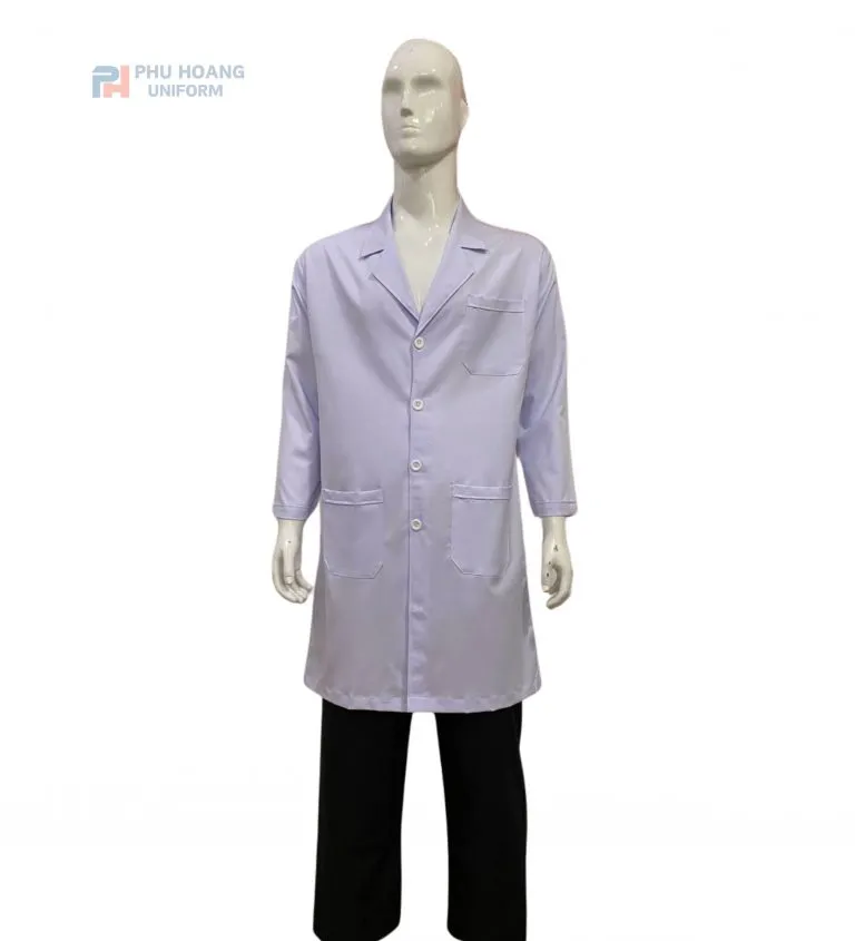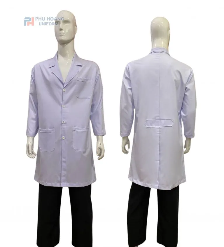 Kiểu dáng: Tay dài (che phủ toàn tay), cổ trụ hoặc cổ bẻ nhỏ gọn tùy mẫu; form áo đứng, may đúng form nam giúp tạo sự thoải mái khi di chuyển hoặc làm nhiều thao tác trong bệnh viện, phòng lab, phòng thí nghiệm; hàng cúc trước dễ mở – đóng.
