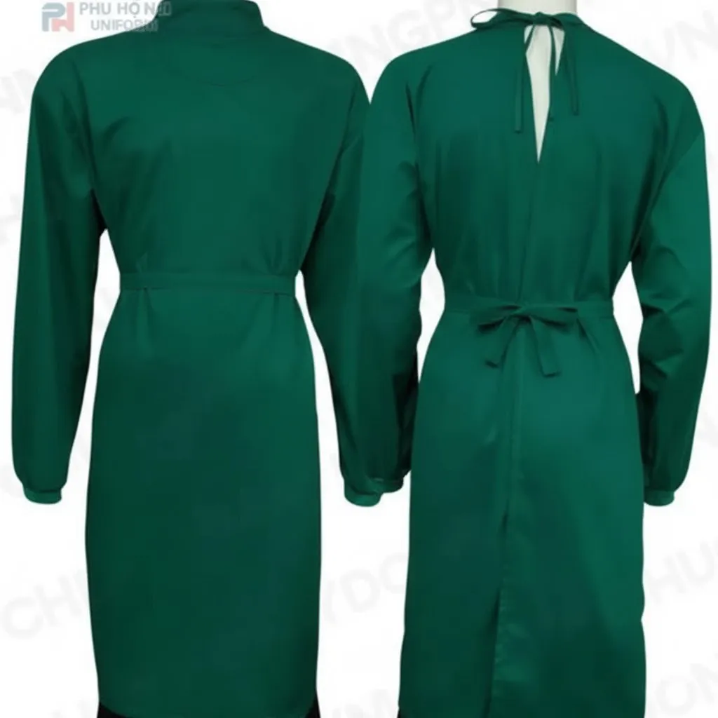 Kiểu dáng: Tay dài che kín tay; thân trước kín, thân sau có thể mở hoặc buộc dây để dễ mặc và tháo; đường may chuẩn, cổ đứng nhỏ gọn, thoải mái; không túi ở vị trí có thể bắt bụi/hóa chất.