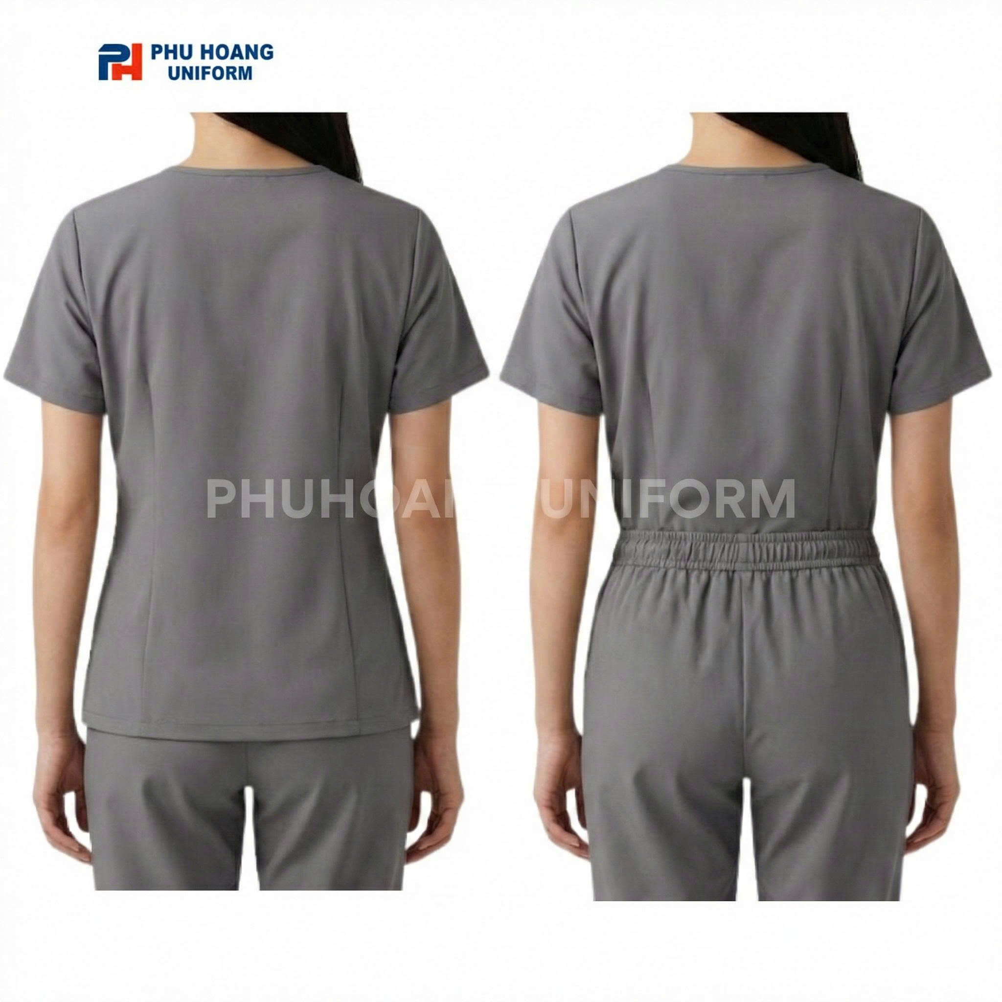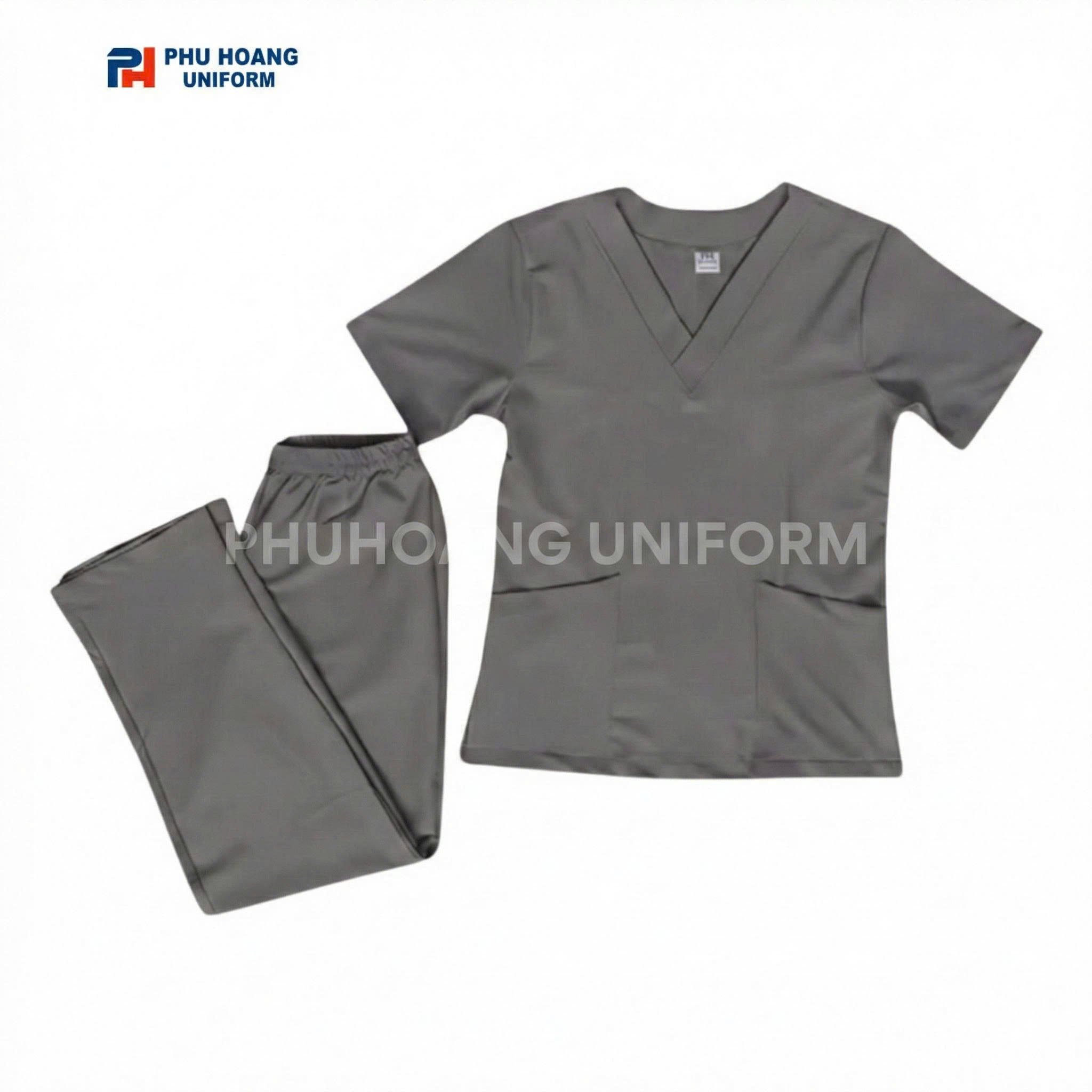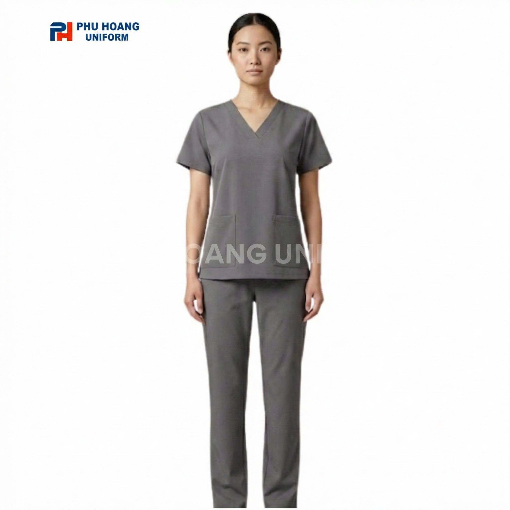 Bộ scrubs cổ tim màu ghi – lựa chọn tinh tế cho môi trường y tế hiện đại