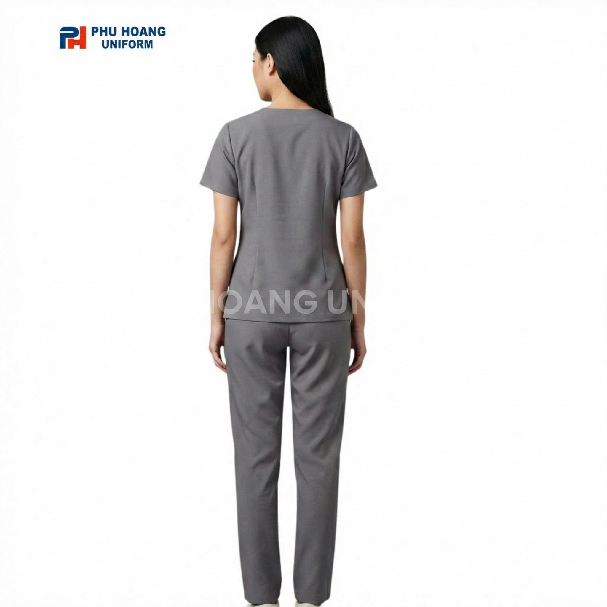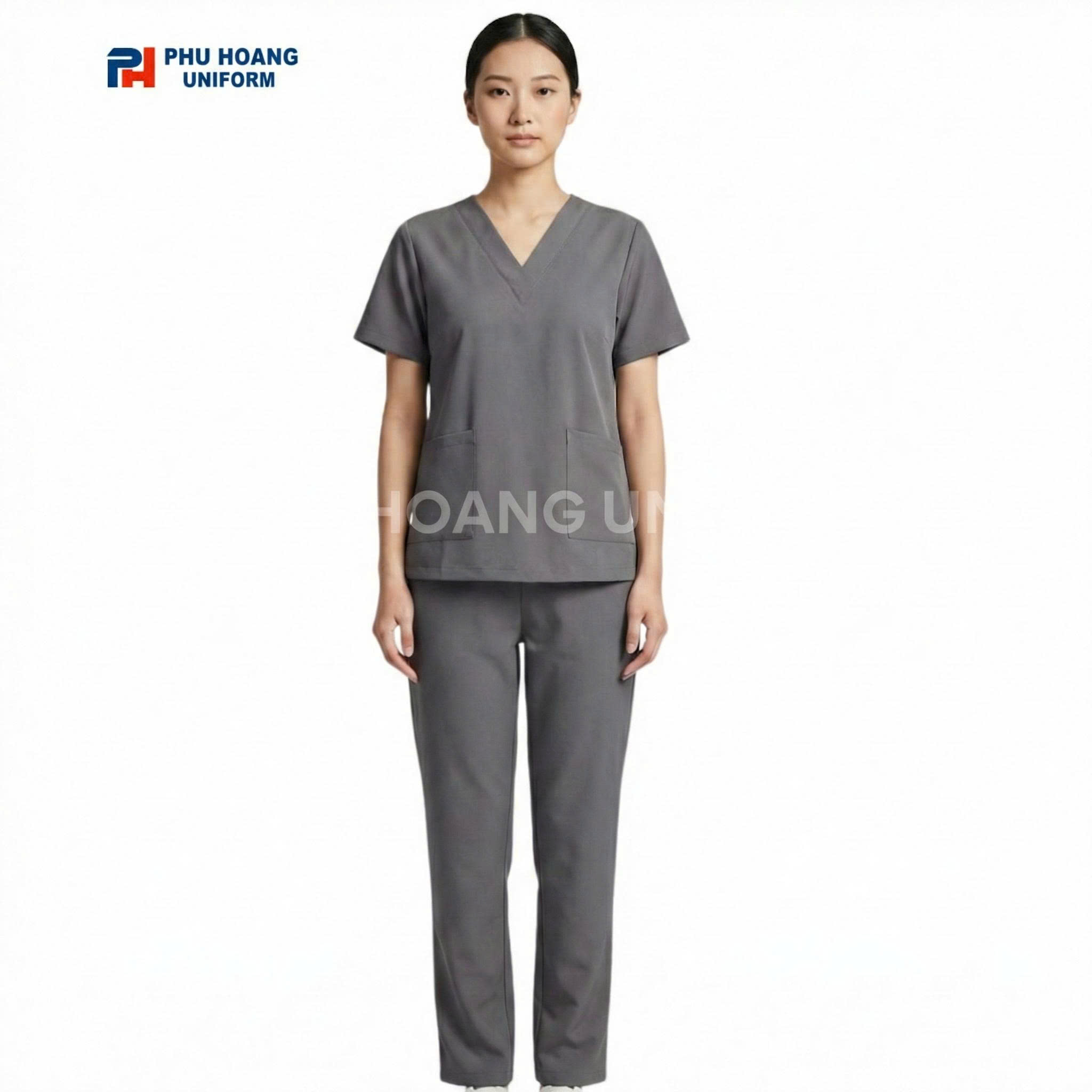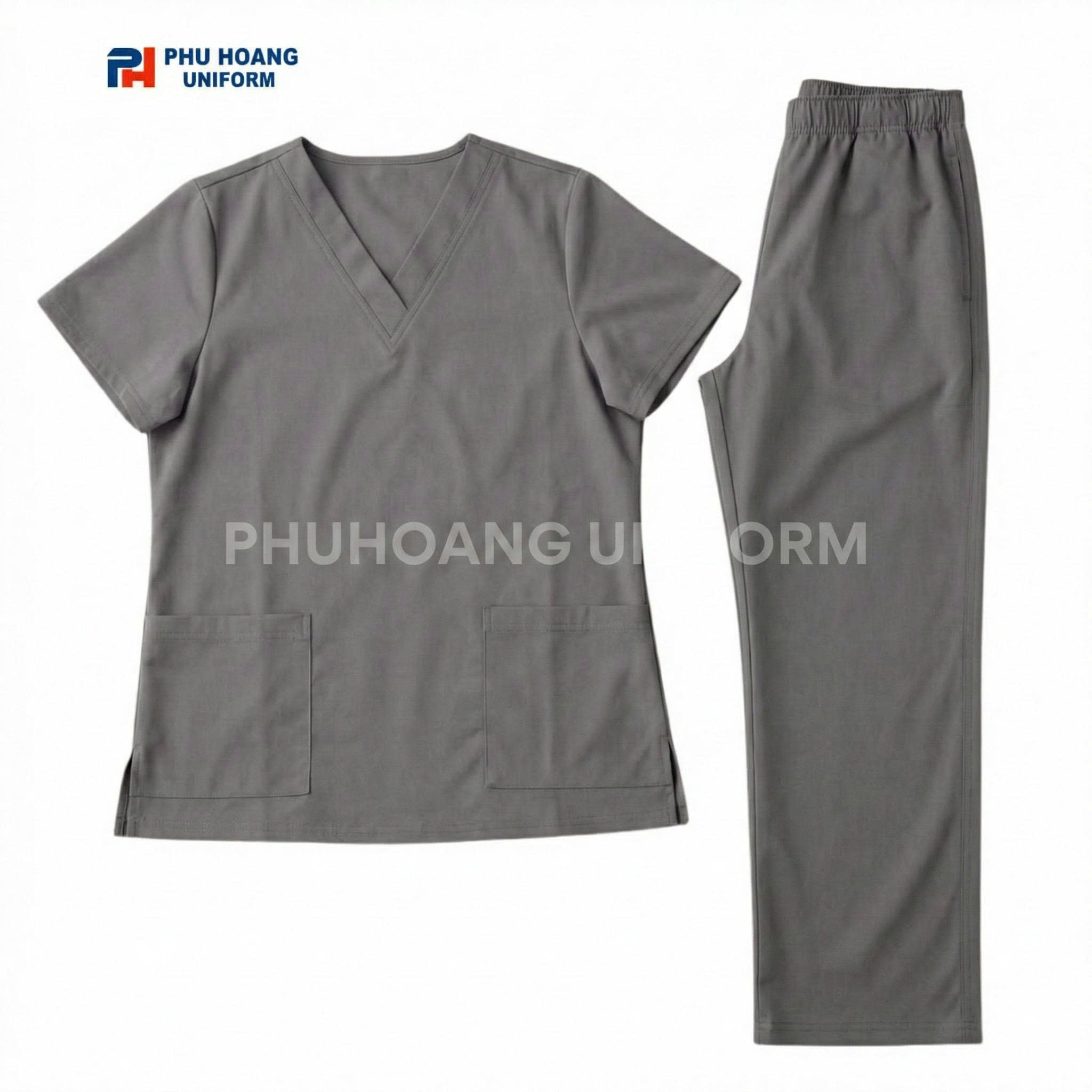 Bộ scrubs cổ tim màu ghi – lựa chọn tinh tế cho môi trường y tế hiện đại