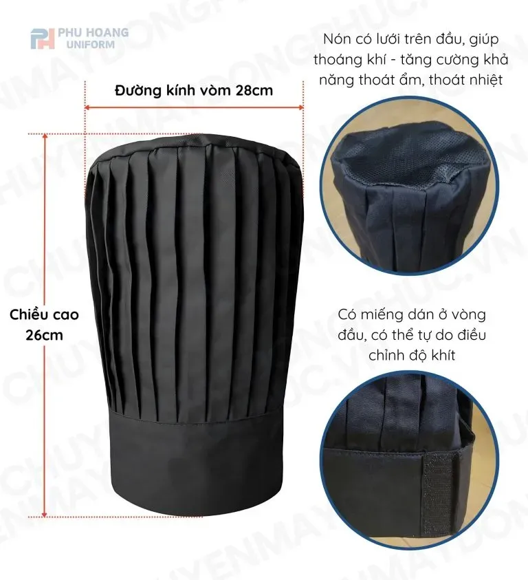 Được sản xuất sẵn bởi Phú Hoàng Uniform – thương hiệu đồng phục hàng đầu Việt Nam, mẫu nón này mang đến giải pháp tối ưu cho mọi nhà hàng, khách sạn, quán ăn, bếp công nghiệp… đang tìm kiếm một chiếc nón bếp vừa đẹp, vừa tiện dụng và bền bỉ.