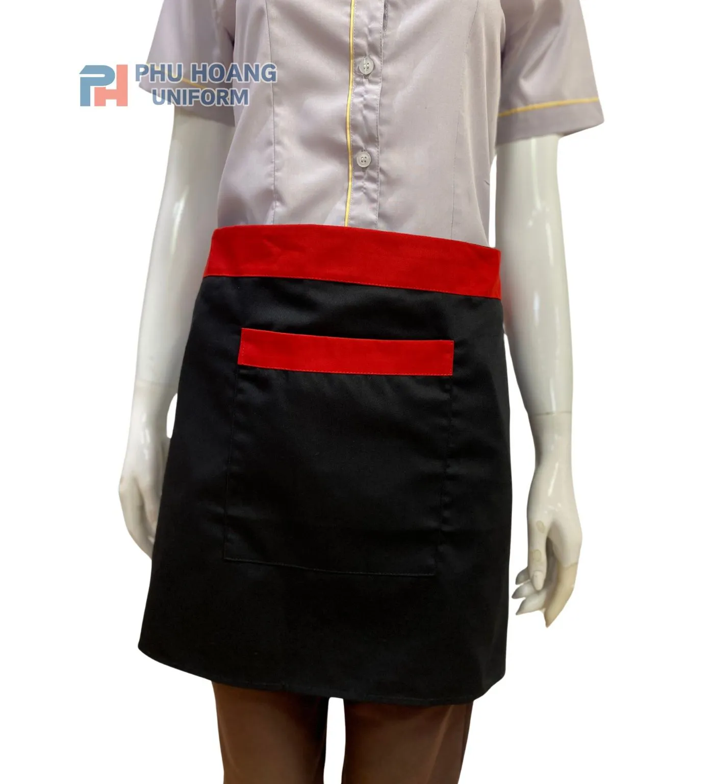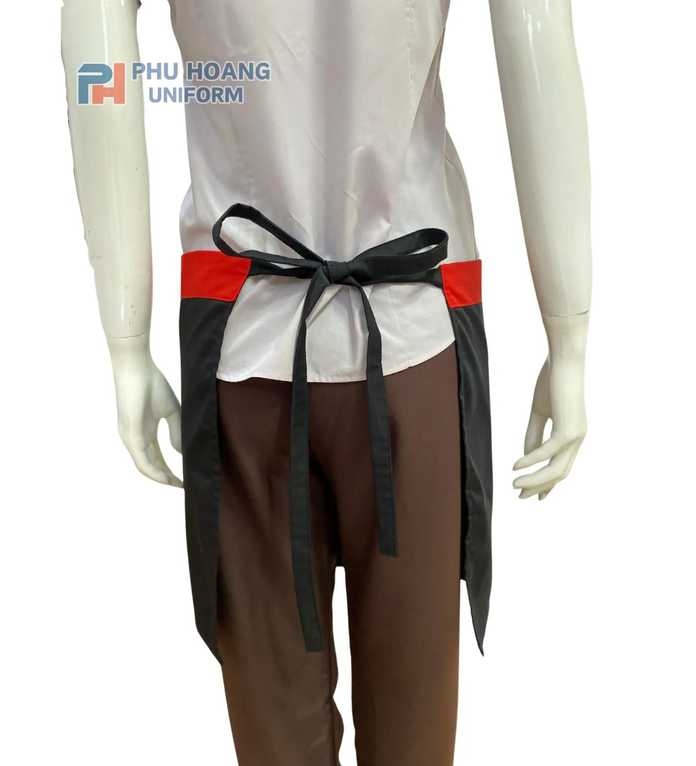 Kiểu tạp dề cột ngang dáng ngắn giúp người mặc di chuyển linh hoạt, không vướng víu khi đứng – đi – cúi người liên tục. Thiết kế này rất phù hợp cho nhân viên phục vụ bàn, pha chế hoặc làm việc tại quầy. Phần che phủ vừa đủ giúp bảo vệ trang phục bên trong nhưng vẫn tạo cảm giác thoải mái suốt ca làm. Đây là lựa chọn tối ưu cho môi trường làm việc cần tốc độ và sự linh hoạt cao.