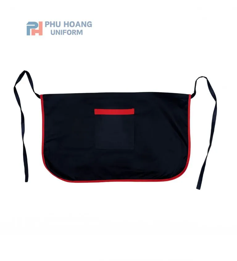 Thiết kế tạp dề cột ngang giúp nhân viên dễ dàng cử động mà không bị vướng víu như các loại tạp dề yếm. Chiều dài ngắn ôm vừa phần dưới eo giúp bảo vệ trang phục, đồng thời linh hoạt di chuyển khi phục vụ bàn, pha chế hay thu ngân. Bo lai đỏ không chỉ tạo điểm nhấn thẩm mỹ mà còn tăng độ chắc chắn ở phần mép, cải thiện tính bền bỉ cho sản phẩm. Kiểu cột ngang cũng cho phép nhân viên đeo và tháo nhanh, giúp quá trình làm việc diễn ra trơn tru hơn.