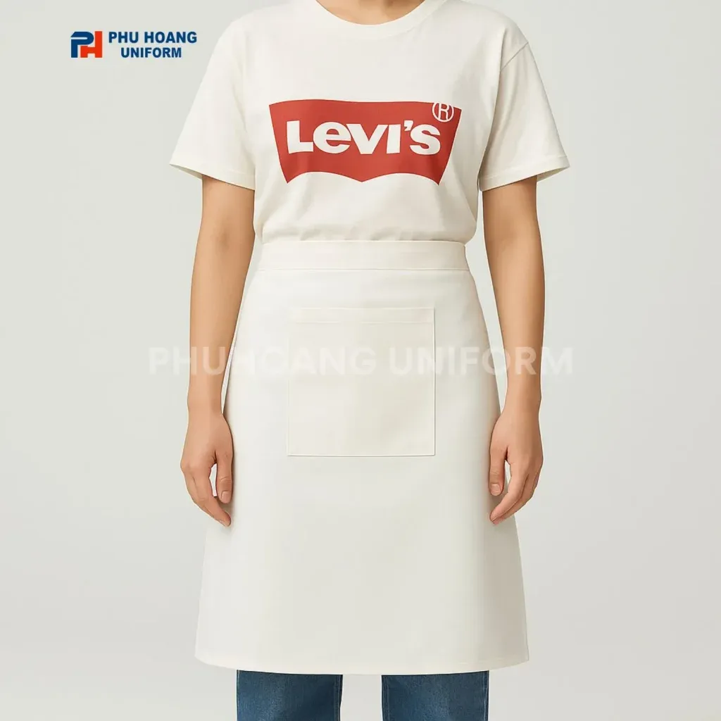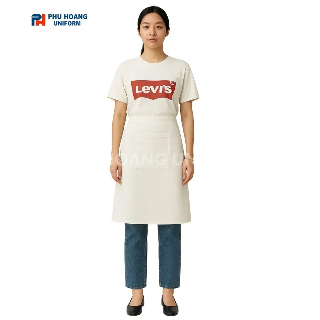 Tông màu trắng kem mang lại cảm giác sạch sẽ, ấm áp và tinh tế hơn so với màu trắng thuần truyền thống. Đây là màu sắc rất được ưa chuộng trong môi trường F&B hiện đại vì tạo cảm giác thân thiện và dễ tiếp cận khi nhân viên phục vụ khách. Trắng kem cũng là tông màu “an toàn” khi phối với đa dạng trang phục bên trong như áo thun đen, sơ mi trắng, polo xanh navy hay áo nâu cà phê.