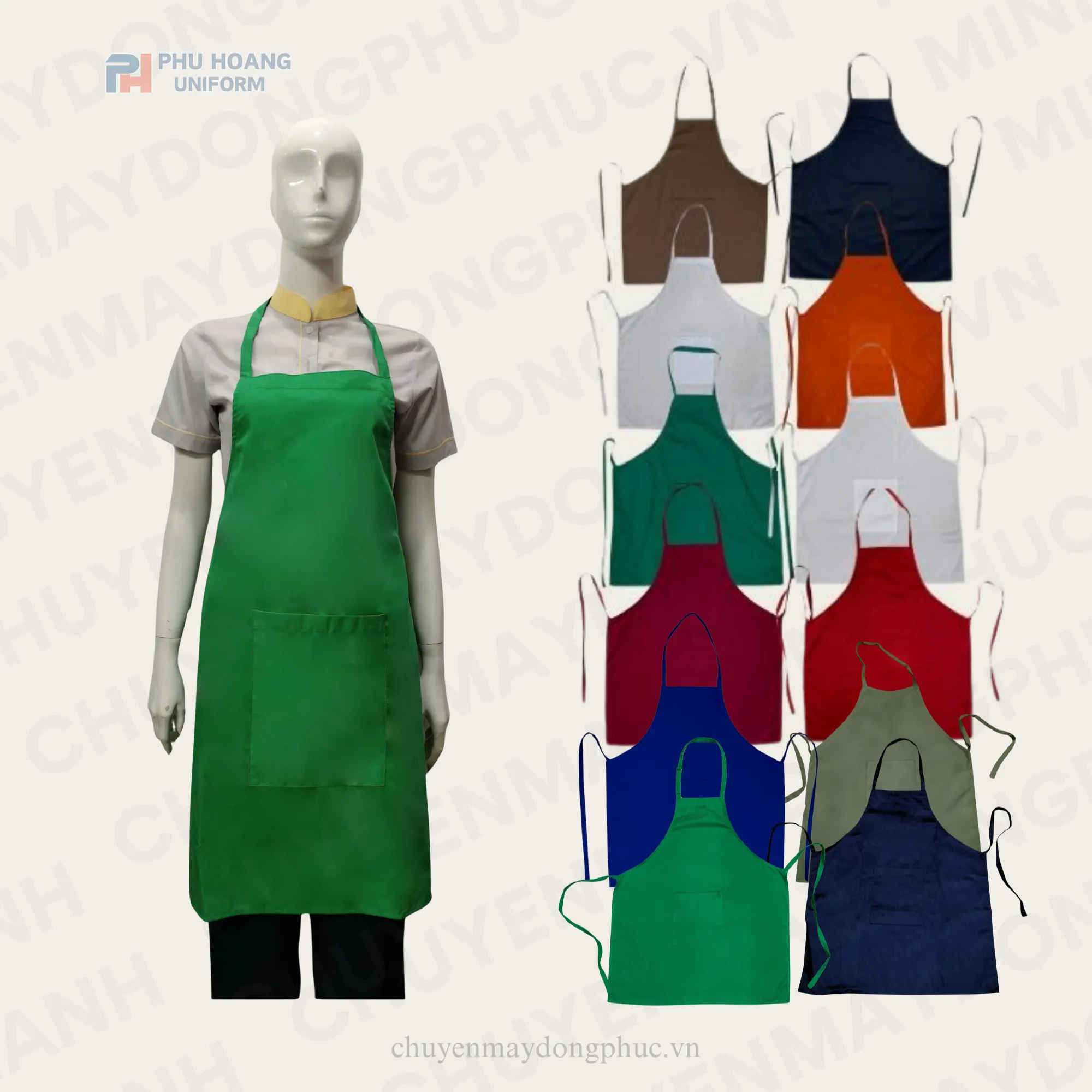 Sản phẩm tạp dề yếm may sẵn của Phú Hoàng Uniform được thiết kế đơn giản nhưng tinh tế, thích hợp cho quán cà phê, nhà hàng, spa, bakery và dịch vụ F&B. Kiểu dáng dài, có túi tiện lợi, dây đeo chắc chắn, giúp bảo vệ quần áo khỏi bụi bẩn và tạo nên hình ảnh đồng bộ, chuyên nghiệp.