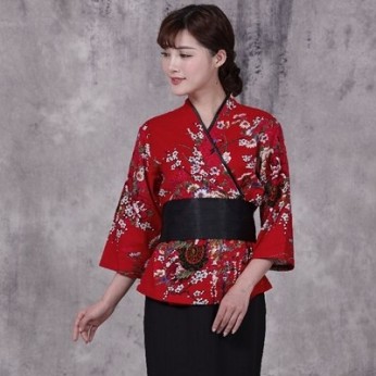 Đồng phục nhà hàng kiểu Nhật đôi khi là những chiếc áo được cách điệu từ chiếc kimono truyền thống, họa tiết hoa văn trên áo mang theo nét đặc trưng của con người Nhật Bản. Chất liệu áo là những loại vải thoáng mát, để nhân viên thuận tiện hơn trong lúc làm việc. Tông màu chủ đạo đa phần là màu đen và đỏ, màu sắc truyền thống trong văn hóa của người Nhật. Khoác lên mình chiếc áo kimono sẽ làm phong cách của nhà hàng trở nên chuyên nghiệp hơn.