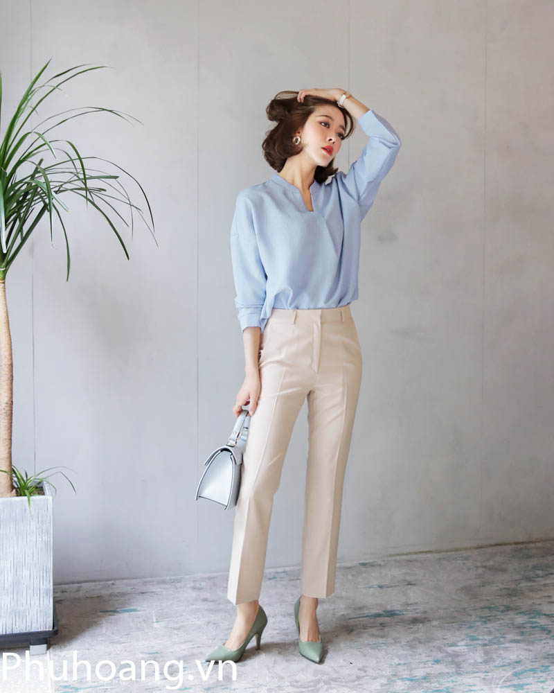 Phú Hoàng đánh giá rất cao set đồ này dựa trên sự tinh tế, và thanh lịch nó mang lại, với việc khéo léo phối mẫu sơ mi với màu xanh thiên thanh nhẹ nhàng, mát mắt, cùng một chiếc quần tây lưng cao, kiểu truyền thống, tone pastel kem đơn giản. Tăng thêm điểm cộng với giày gót nhọn và túi xách kích thước vừa vặn.