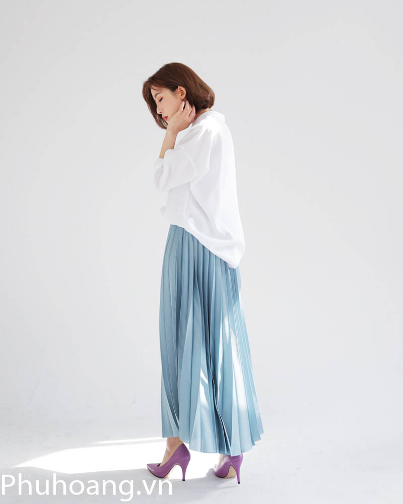 Nhìn chung, tổng thể set đồ này khá ổn, với chiếc áo sơ mi trắng form rộng cùng với chân váy xếp ly dài, đây thực sự là một set đồ lý tưởng cho những nàng có những khuyết điểm ngoại hình như: chân to, eo thô, chiều cao khiêm tốn… Việc phối cùng một đôi giày cao gót mũi nhọn basic màu tím được xem là một điểm nhấn thu ví, tạo sự nổi bật cho set trang phục này.