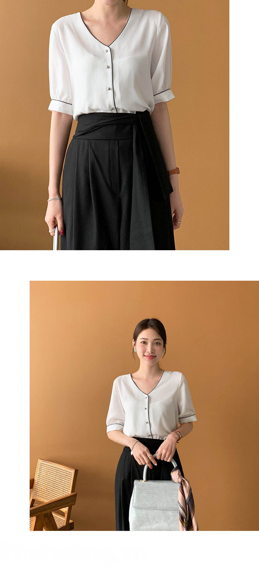 Với chiếc áo sơ mi lụa trắng đơn giản, tay phồng, cổ tim viền đen mềm mại, phối cùng quần culottes đen cũng thiết kế đơn giản không kém với phần dây cột lệch cùng màu, mang cùng một đôi sandal gót thô dây to bản, cùng túi xách xám thanh lịch, tạo cho người mặc nét thanh lịch, khí chất khi diện mẫu đồng phục này.