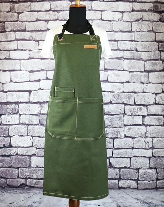 Tạp dề highlight viền trắng nổi bật trên tông xanh rêu đậm.