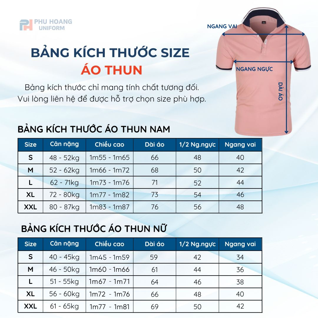 Kích thước tham khảo của các loại đồng phục tại Phú Hoàng Uniform. Liên hệ trực tiếp để được tư vấn thêm!